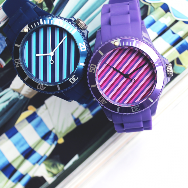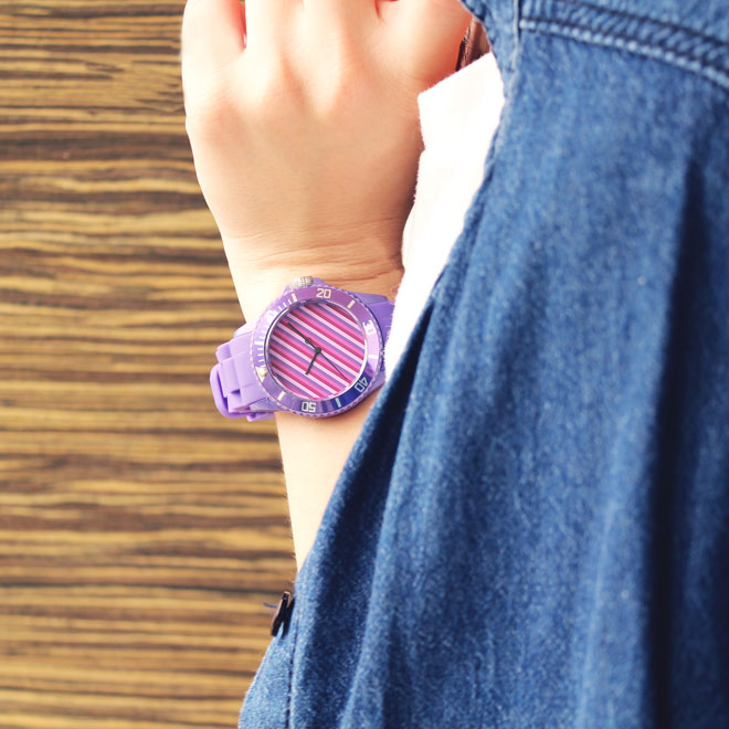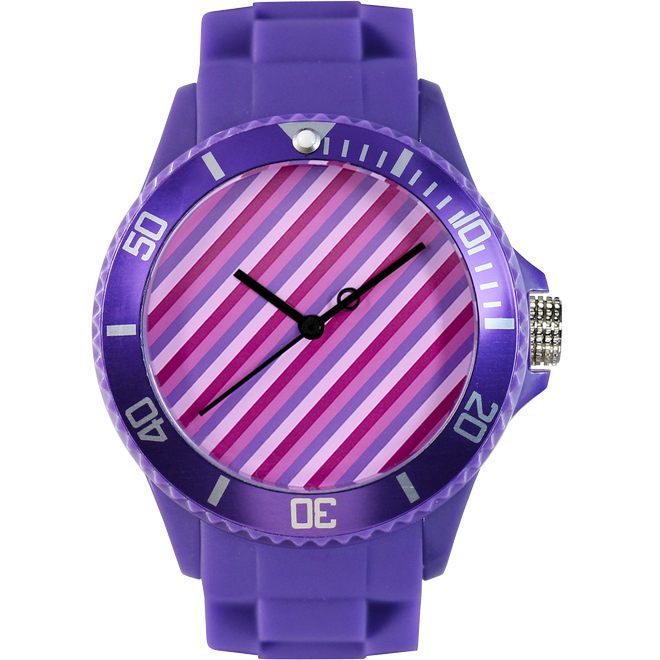 錶盤視覺以斜線為主,運用與錶殼相近色系帶出層次感,而錶針則是使用簡單的藍白色,讓錶針在繽紛的錶盤旋轉時,看起來像是拿著魔法筆的色彩家,不停地創造出令人驚喜的彩色世界。