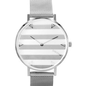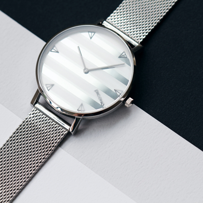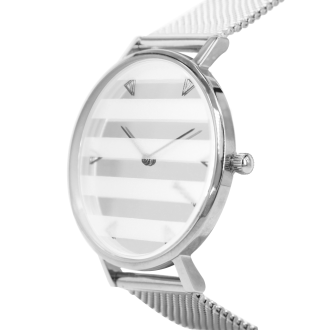 整體外觀以銀色不鏽鋼材質為主的Re Time系列,將錶款的玻璃透過特殊工法加工後,以亮與霧交錯呈現,並與錶款特殊鏡子面結合,展現出錶款虛實結合的樣貌。