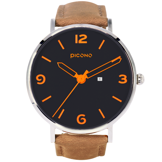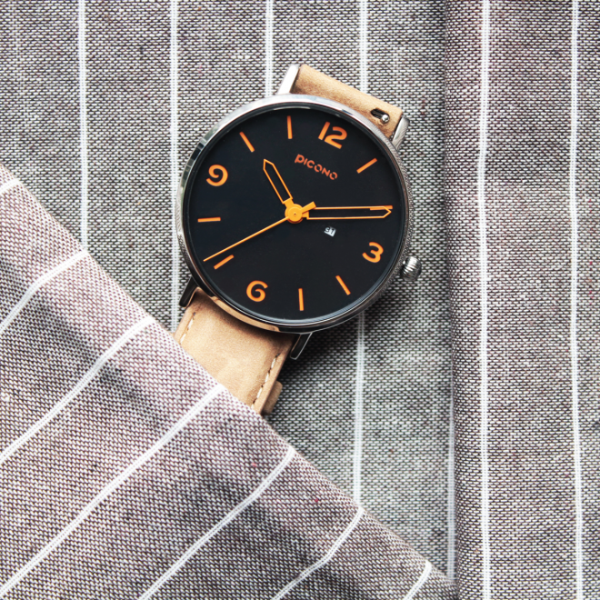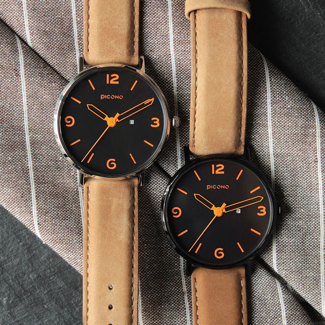 Teen系列以暗色系的深藍色作為錶面底色,再使用亮眼的橘色作為時位與錶針的主要色系,讓整體錶款產生強烈的對比性,錶帶則選用沉穩的瘋馬皮,整體傳遞出男士們陽光紳士的性格。