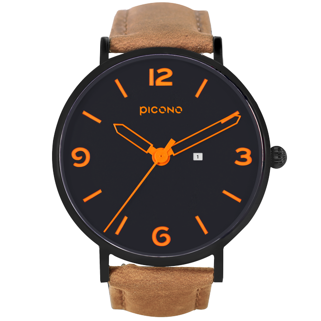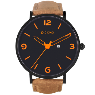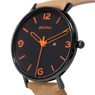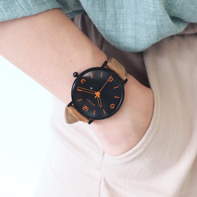 Teen系列以暗色系的深藍色作為錶面底色,再使用亮眼的橘色作為時位與錶針的主要色系,讓整體錶款產生強烈的對比性,錶帶則選用沉穩的瘋馬皮,整體傳遞出男士們陽光紳士的性格。